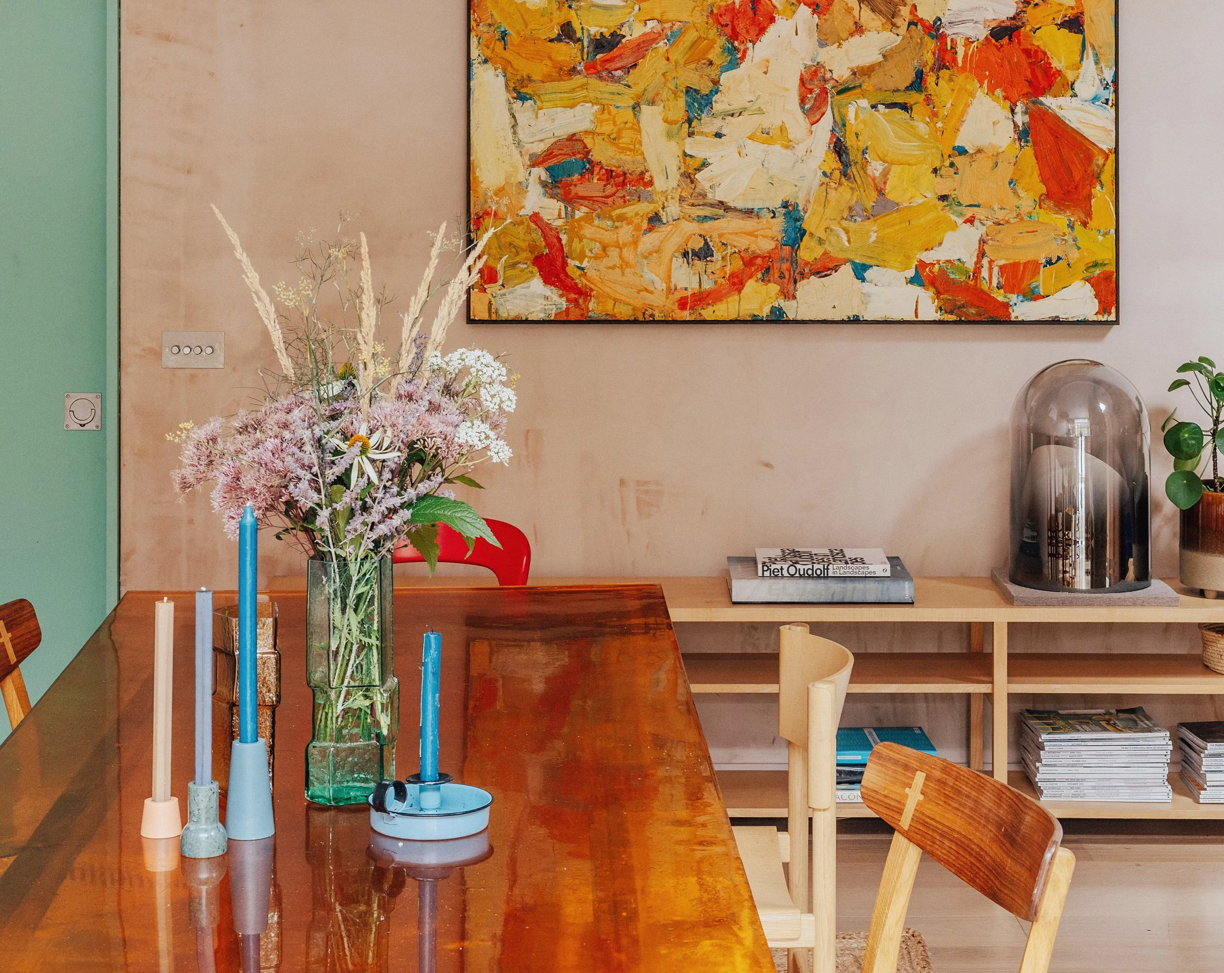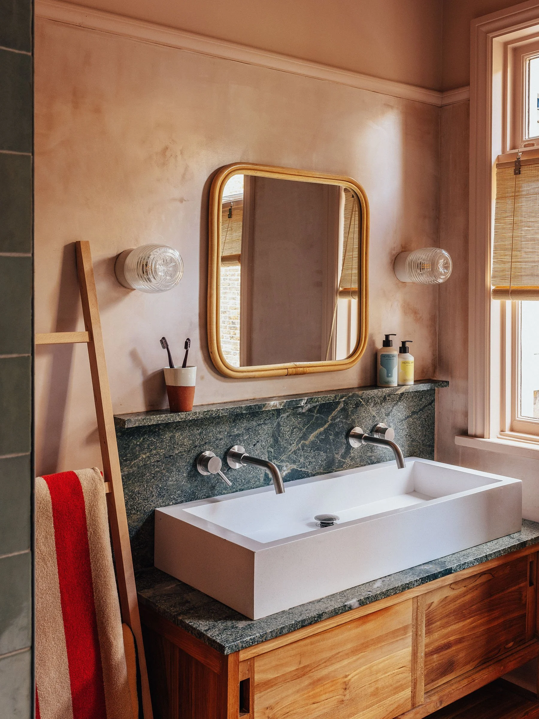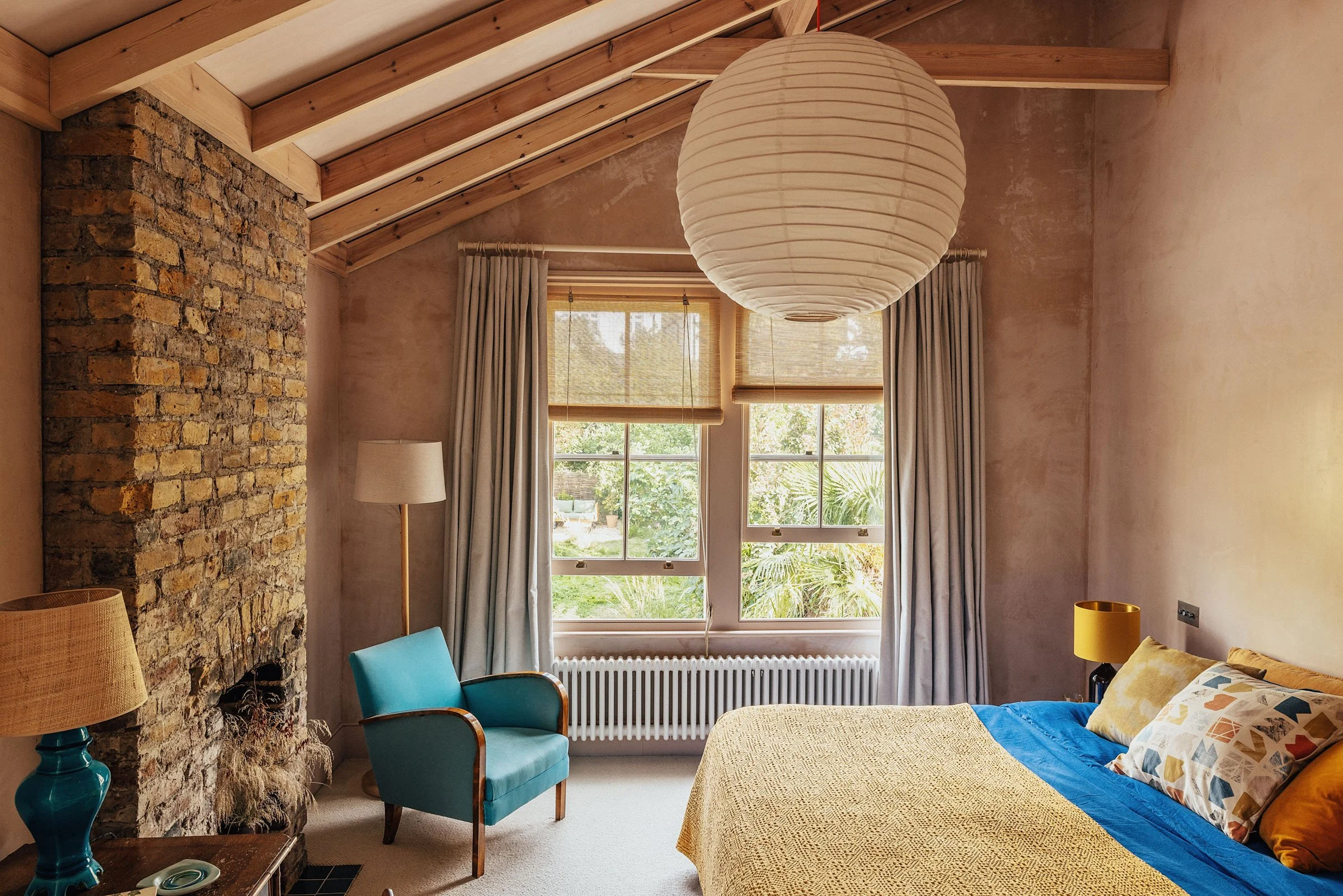 The whole house refurbishment includes a rear extension and master bedroom conversion, celebrating raw, warm materials including thistle plaster, exposed brick and steel, complemented by natural elements such as rattan, stone, douglas fir joinery and oak timber flooring. Tranquil and welcoming, with vibrant accents of colour and dramatic ceiling heights.